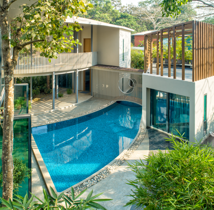 Moon House blends contemporary architecture with traditional Goan elements, featuring sleek lines, natural materials like wood and stone, and open-plan layouts. The design incorporates large windows and doors that connect indoor and outdoor spaces, offering panoramic views. This fusion creates a visually stunning and functional residence, harmonizing modern living with Goan heritage.
